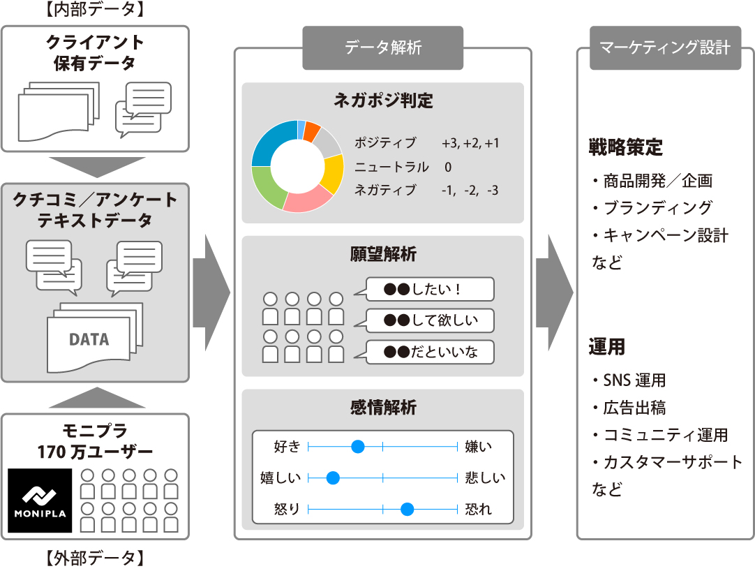 テキストを記述したユーザーのネガティブ・ポジティブ(評判)傾向を7段階で構造化する「ネガポジ判定」、メタ構文解析(※2)で欲求意欲(「~したい」、「~してほしい」、「~だといいな」等)を読み取る「願望解析」、文中の形容表現類を抽出し3軸(好き/嫌い、嬉しい/悲しい、怒り/恐れ)×7段階の感情分布を集計することでユーザーの感情を精緻に判定する「感情解析」といった高精度な解析エンジンによってテキストデータを分析し、レポートを作成します。