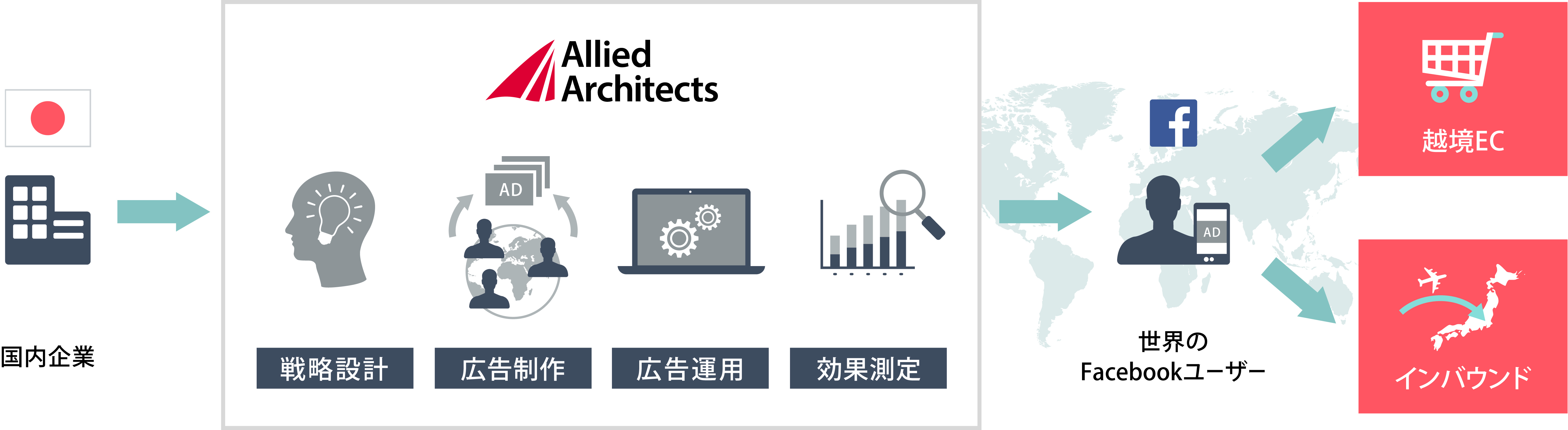 アライドアーキテクツ株式会社(本社:東京都渋谷区、代表取締役社長:中村壮秀、証券コード:6081)は、越境ECなどの海外進出を行う国内企業に向けて、世界各国・地域の言語や文化に最適化したFacebook広告運用をワンストップで支援するパッケージサービスを提供開始いたします。