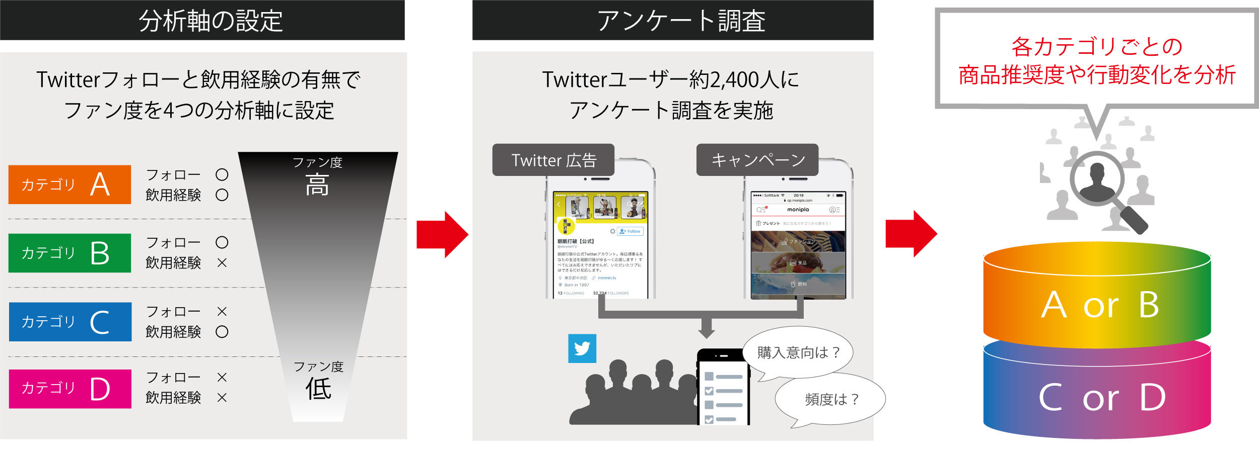 そこで2016年末、アライドアーキテクツのSNS運用支援サービスやキャンペーンプラットフォーム「モニプラ」を活用し、Twitterのマーケティング成果を可視化する取り組みを開始。独自の分析軸によるアンケート調査を実施し、ユーザーにおける商品推奨度や意識・行動の変化について分析を行いました。