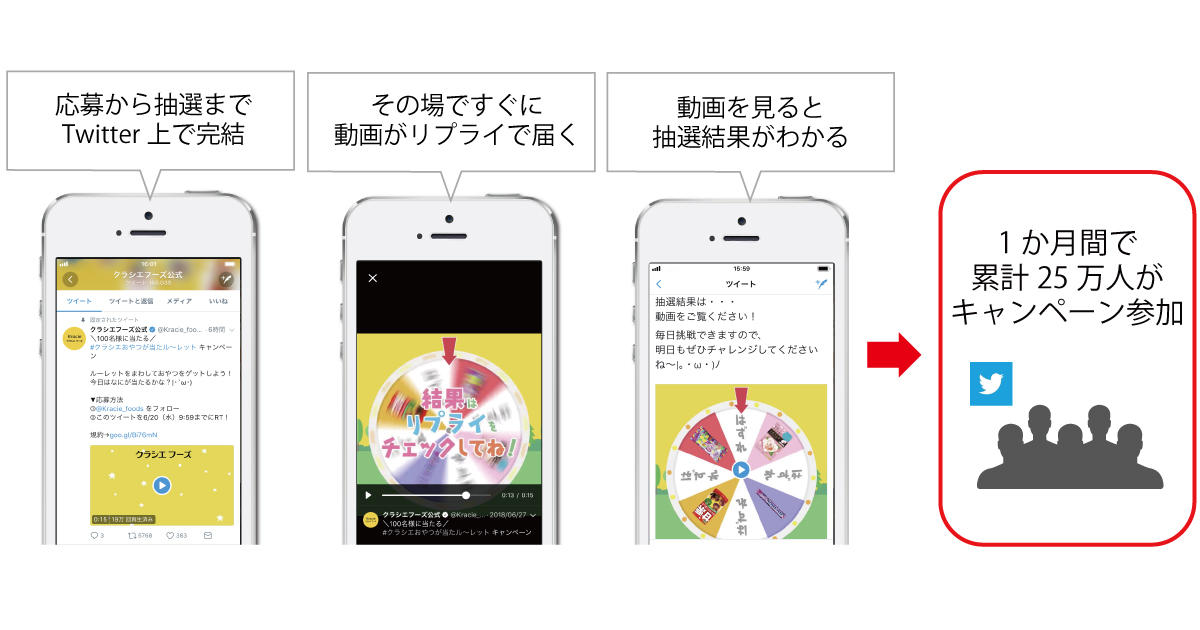 - インスタントウィン型のキャンペーンをTwitter上で実施、主婦層を中心に情報が拡散され約1か月間で累計25万人が参加