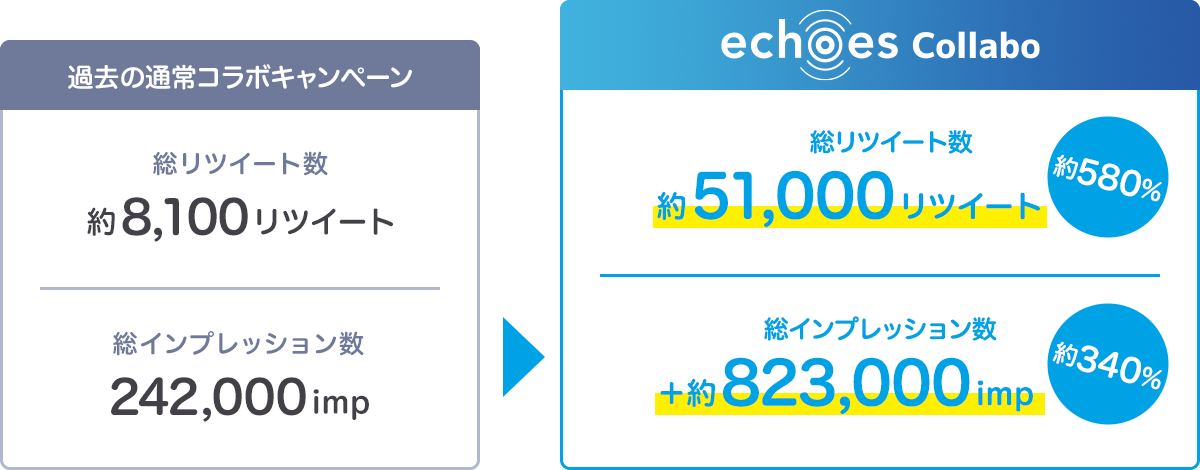 また、沢の鶴社が、以前Twitter上で他社と(インスタントウィンを利用しない)コラボキャンペーンを実施した際の成果と比較すると、今回のechoes Collaboを活用したインスタントウィン形式のコラボキャンペーンの総リツイート数は580%、総インプレッション数は340%となり、従来の(インスタントウィンを利用しない)コラボキャンペーンよりも高い成果につながりました。