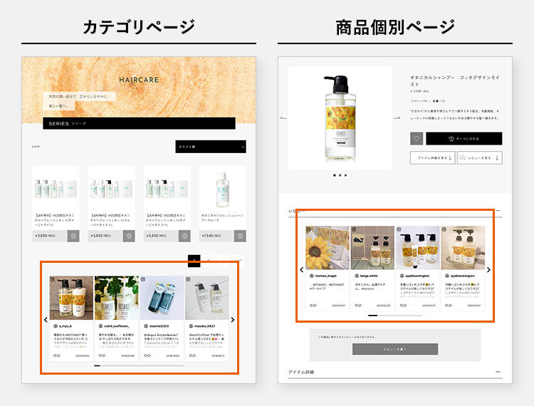 また、ヘアケア・ボディケア製品等を展開するボタニカルライフスタイルブランド「BOTANIST」でも、カテゴリページに加え、商品個別ページにUGCを設置することで、各ページに最適化したUGC表示を実現しました。