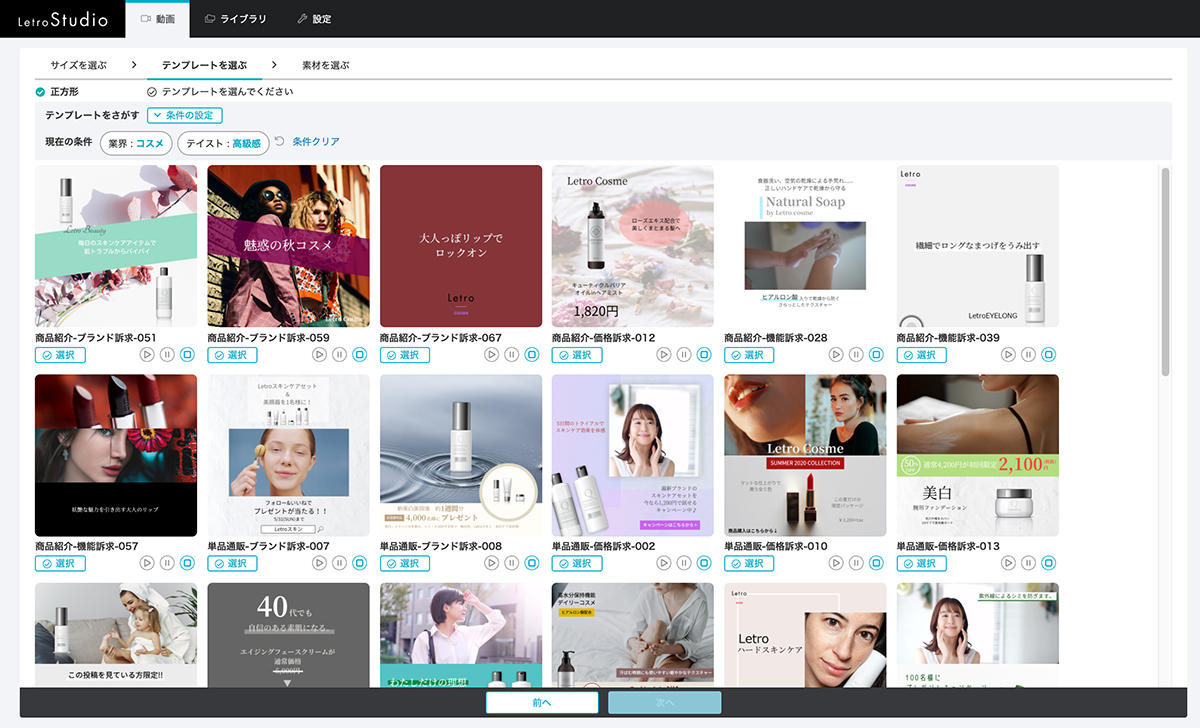 各媒体や各業界の動画活用パターン、シーンなどの研究を通して、この度累計約700個の動画テンプレート拡充に至りました。コスメ、食品、サプリ、教育、不動産など各業界に最適化したテンプレートに加え、SNS広告やYouTube、ECサイト、リアル販促などの活用パターン別のテンプレートを拡充させたことで、企業の利用目的に合わせた質の高い動画クリエイティブの量産が可能となります。