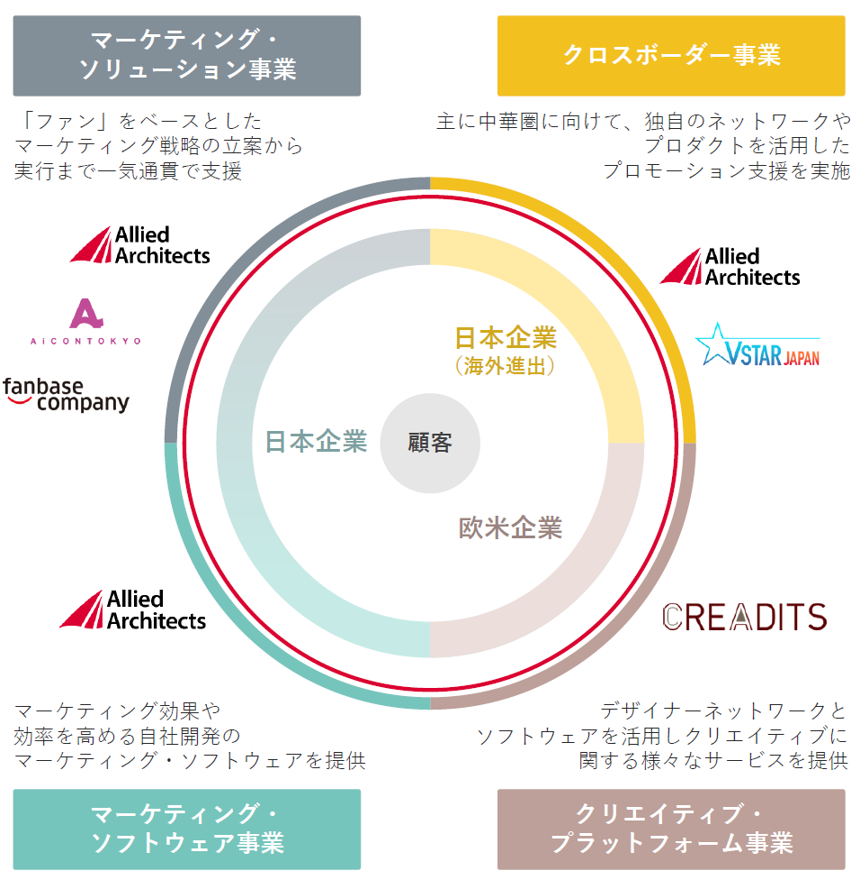 現在では、「マーケティング・ソリューション事業」「マーケティング・ソフトウェア事業」「クロスボーダー事業」「クリエイティブ・プラットフォーム事業」という4つの事業を日本と海外において展開し、これまでに累計4,000社以上の支援を行ってまいりました。そして、国内の子会社としてAiCON TOKYO株式会社及びVstar Japan株式会社、海外の子会社としてCreadits Pte. Ltd.、Allied Tech Base、Allied Tech Camp、さらに国内の持分法適用関連会社である株式会社ファンベースカンパニーというグループ会社6社を擁しています。