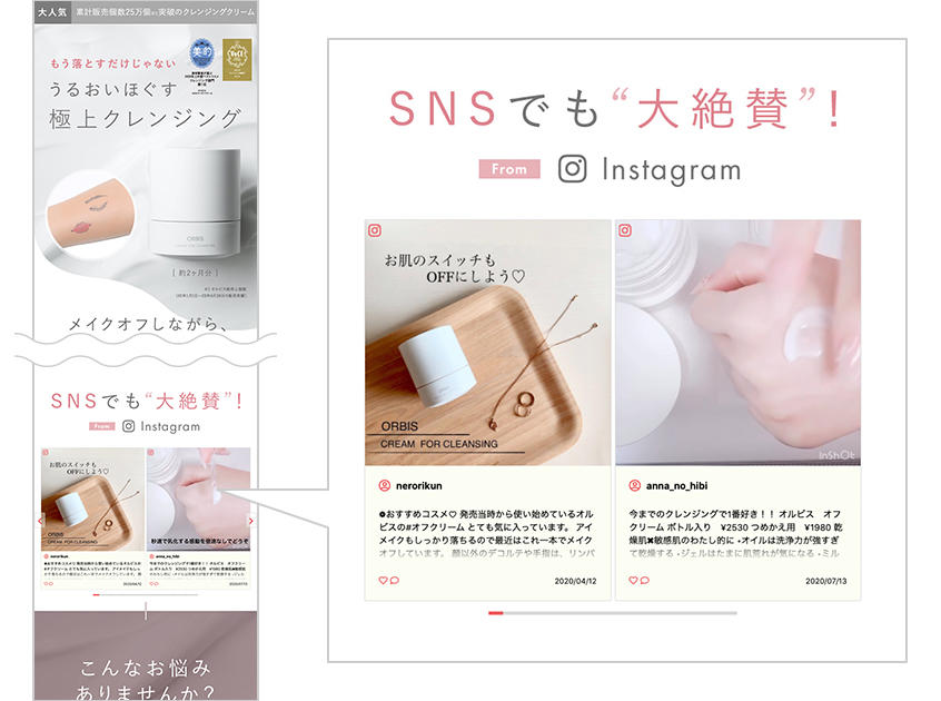 オルビスでは新規顧客獲得の入口となるLP(ランディングページ)において、ページを訪れた人のCVR(購入率)向上のために様々な施策を実施しています。そのなかで、SNS上に多くのお客様による商品の体験談やクチコミの投稿が増えたことからUGCの活用にも着手しました。