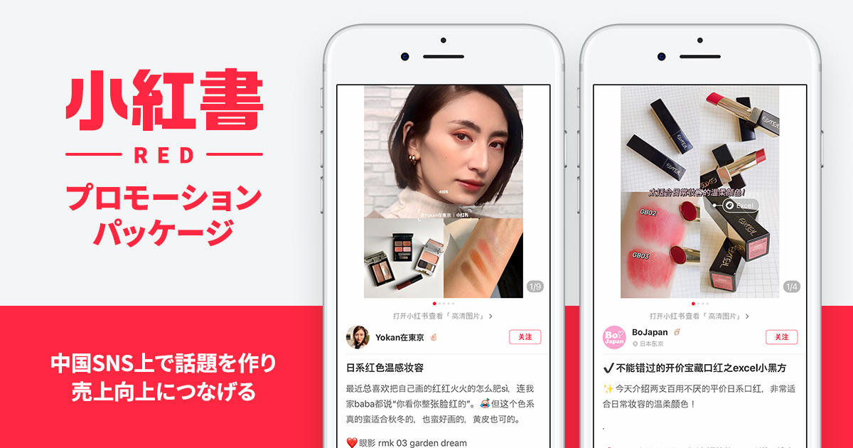 「小紅書(RED)プロモーションパッケージ」は、中国展開を実施・検討中の美容系企業向けに、企業公式アカウントの運営、KOLプロモーション・KOCプロモーションの実施を組み合わせて、小紅書(RED)上で商品・ブランドについての話題化や口コミの創出を実現し、売上向上につなげるサービスです。