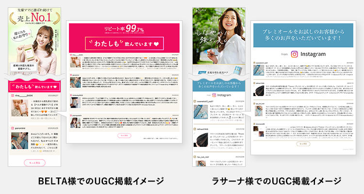 新デザインを先行活用した海藻コスメブランド「ラサーナ」では、新規顧客獲得ランディングページ(LP)にレビューベースのUGCを表示したことで、ビジュアルメインの表示デザインと比較して、CVR1.2倍を実現しました。また、マタニティ・ベビーケアからヘアケア、ボディケアまで幅広い商品を展開する女性ライフステージブランド「BELTA」でも、同様の改善をしたことでCVR1.47倍を実現しました。