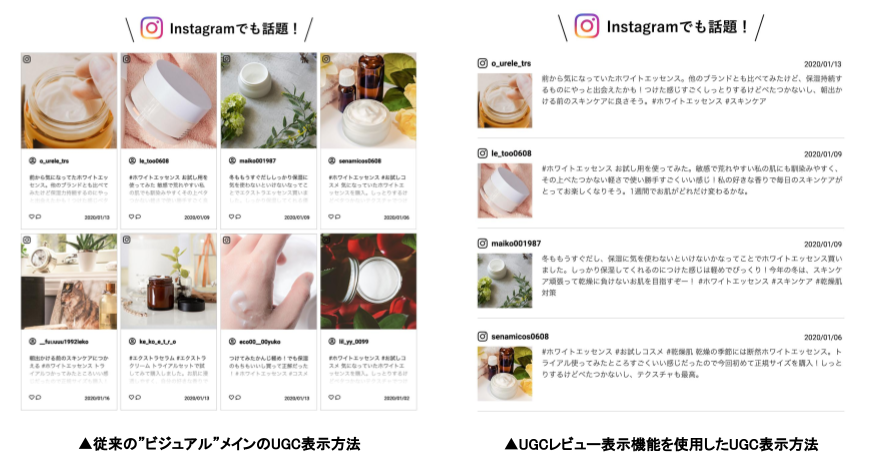 ユーザーがInstagram上に投稿したレビュー(コメント)を強調して表示するデザインを新たに追加しました。ユーザーが投稿した効果実感や感想の訴求をテキストメインで表示できるため、ビジュアルとは異なる形でユーザーボイスを商品購入検討者に届けることが可能となります。
