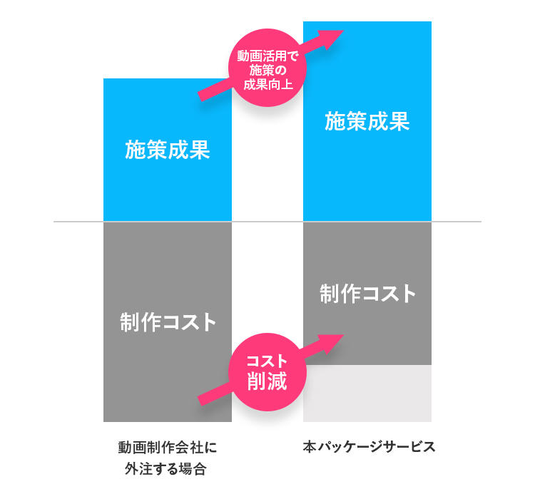 本パッケージサービスをご導入いただくことによって、動画制作ツール「LetroStudio」を活用してパフォーマンスの高いプロモーション用動画を安価で制作することができます。これにより、動画制作に関する外注費用を含む施策への投下コストを削減することが可能になります。さらに、視覚的に訴求力の高い動画を活用することによってキャンペーンのパフォーマンスが高まり、施策の投資対効果を向上させることが可能です。