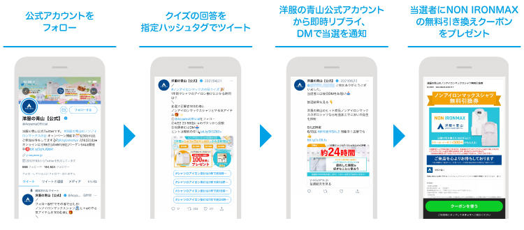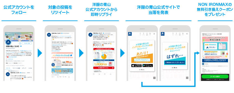 これまで洋服の青山に来店したことがない新規顧客層にも情報をリーチさせることで、商品・ブランドの認知拡大だけでなく、新しいユーザーとの接点(コミュニケーション機会)創出を狙ったキャンペーン。洋服の青山公式アカウントをフォロー&RTをするとその場でリプライが送られ、当選者はNON IRONMAXの無料引き換えクーポンがもらえるという流れ。