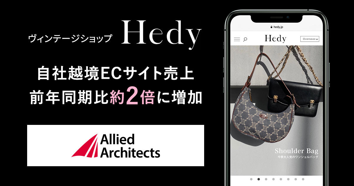 SaaSとデジタル人材で企業のマーケティングDXを支援するアライドアーキテクツ株式会社(東京都渋谷区、代表取締役社長 CEO:中村壮秀、証券コード:6081)は、株式会社ファイヤーワークス(代表取締役社長:小松大輔、本社:東京都渋谷区)が運営するヴィンテージショップ「Hedy(エディ)(※以下、Hedy)」に対して集客促進のためのKOL、在日中国人を起用した中国向けマーケティング施策を行い、Hedy越境ECサイト売上が前年同期比約2倍に増加しましたのでお知らせいたします。