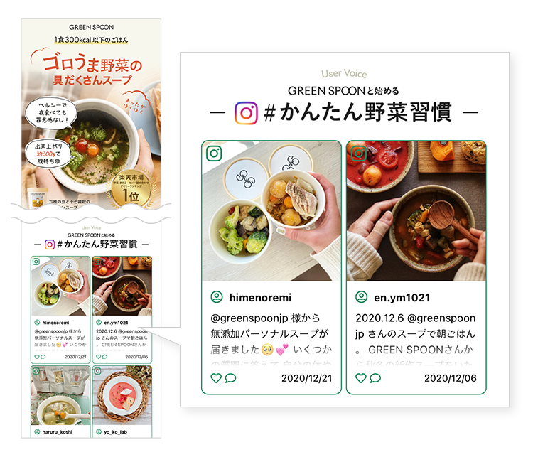 GREEN SPOONの新規顧客獲得向けLPにLetroを活用したUGCの掲載を開始しました。野菜スープ用の新規顧客獲得向けLPにおいて、UGC掲載後のパフォーマンスをもとにUGCの表示位置やデザインなどをスピーディーに改善することによって、わずか2週間でCVR1.5倍を実現。食品領域におけるUGC活用に精通した専任コンサルタントのサポートにより、検討層に対して自然な形で商品購買の後押しとなる最適なUGC表示が可能に。最短でのKPI改善が実現されました。