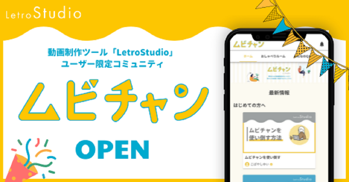 ムビチャンは、LetroStudioを利用するユーザー同士がカジュアルにコミュニケーションを取ることができ、動画制作に関わる広範な情報収集と問題解決が行えるオンライン空間です。LetroStudioユーザーが自らの販促成果や挑戦を共有してデジタル販促の新たな知見を得ることで、ユーザー自身が向き合う業務の成果を向上できるコミュニティを目指します。