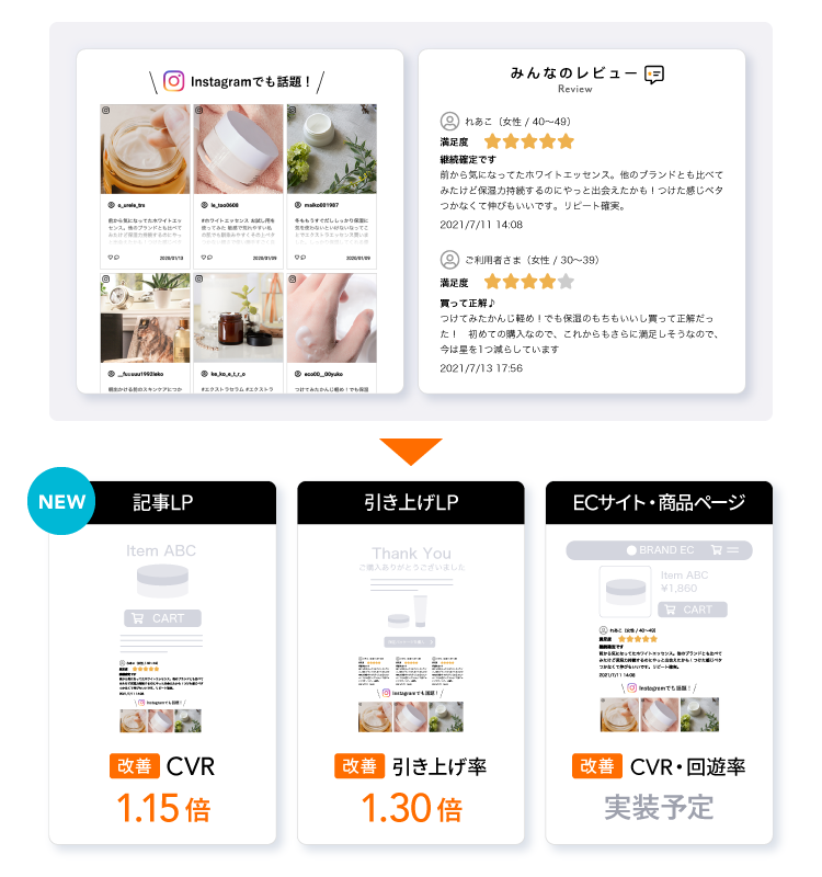 このような獲得LPでの成功を受け、さらなる新規獲得成果の向上のために獲得LPだけでなく、潜在顧客や購入検討層との接点となる他のページにもUGC・レビューの活用の幅を拡大させることで、複数の導線の相乗効果を狙うことを決定。第一弾として潜在顧客へのアプローチの接点である記事LPにレビューを掲載し、効果検証と改善を繰り返し行うことで潜在顧客の引き上げ率を高め、新規獲得件数の向上を目指していくことになりました。