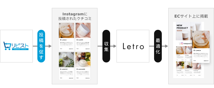 さらに、収集されたUGCはLetroに同期され、サイト上への表示から最適化まで行えることから、成果ポイントが可視化でき、結果的にROIの計測が可能になります。これらの機能により、UGC施策の実施に至らない要因を取り除くことができ、さらに「生成・収集・活用・効果測定・改善」のサイクルを定期的に回しながら、UGCの効果を最大化する仕組みを提供します。
