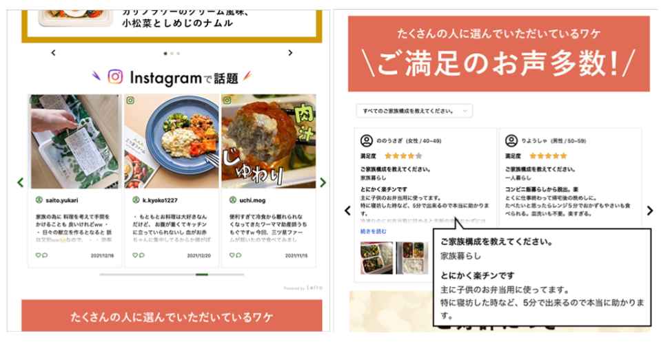 これまで三ツ星ファームでは、新規顧客獲得向けLPにおける獲得効率を向上させるために、ユーザーによって投稿されたInstagram投稿やレビューをユーザーボイスとして掲載していました。しかしながら、そのユーザーボイスはWeb上のデザインとして埋め込まれ、"静的"(表示が固定した状態)に表示されていたことにより、第三者が発信するコンテンツの強みを上手く活かせている状態ではありませんでした。