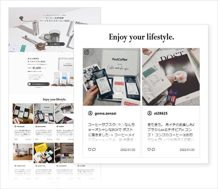 PostCoffeeが展開するサブスクリプションサービス「コーヒーのサブスク あなた専用のコーヒーボックスがポストに届くコーヒーの定期便」の新規顧客獲得向けLP(診断ページ)と診断結果ページに、UGCの掲載を開始。同時に、施策成果の最大化を目指すためにUGCの最適化を行う運用をスタートさせました。Letroを用いてファンの方によってInstagram上に生成された熱量の高いUGCを収集し、各ページに掲載。さらに、UGCの表示位置やUGC掲載部分のサイトデザイン、周辺バナー画像のA/Bテストなどの検証~運用を順に実施しました。
