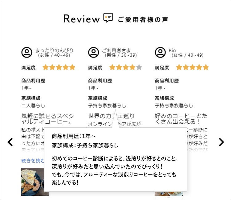 そこで、昨今食品のD2Cブランドや大手通販メーカーにおいて、ECサイトやLP上に掲載するUGCの効果検証と改善を繰り返し行うことで施策成果向上につなげる実績が相次いでいることから、PostCoffeeでもUGCを活用する施策への新規投資を決断。これまでファンによって生成された熱量の高いUGCをサブスクリプションサービスの新規会員獲得向けLPに掲載し、「UGCの生成・活用・効果測定・改善」の運用サイクルを継続的に回しながら、施策成果の最大化を目指すために、Letroの導入へと至りました。