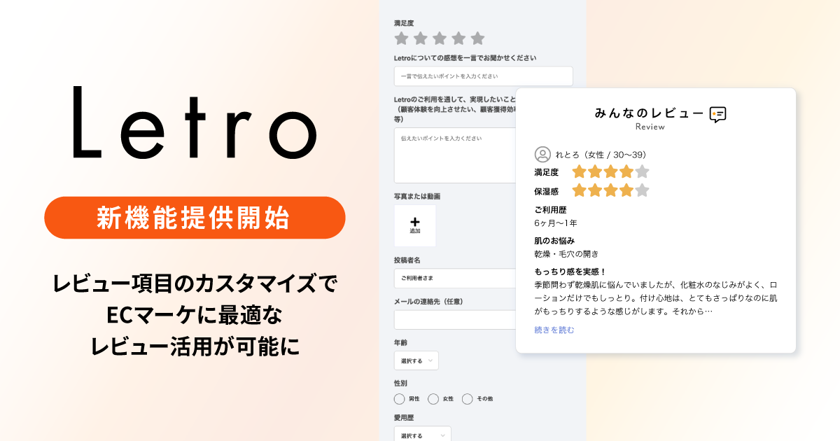 企業のマーケティングDXを支援するアライドアーキテクツ株式会社(東京都渋谷区、代表取締役社長 CEO:中村壮秀、証券コード:6081)でSaaS事業を展開するプロダクトカンパニー(カンパニープレジデント:村岡弥真人)が提供する運用型UGC(※1)ソリューション「Letro(レトロ)」は、ユーザーの詳細なレビューの収集から掲載までを行うための新機能として「レビュー項目設定機能」の提供を開始しましたのでお知らせいたします。