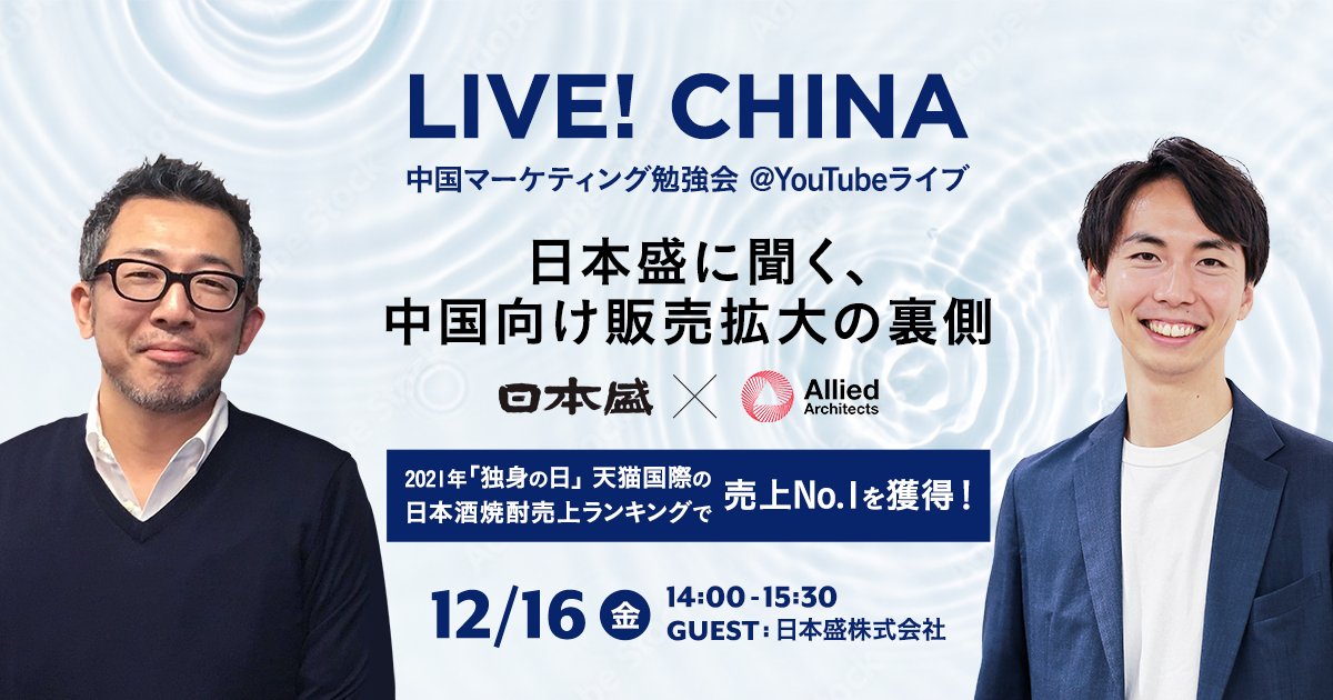 企業のマーケティングDXを支援するアライドアーキテクツ株式会社(東京都渋谷区、代表取締役社長 CEO:中村壮秀、証券コード:6081)で中国進出支援事業を展開するクロスボーダーカンパニー(カンパニープレジデント:番匠達也)は、企業の中国向け施策ご担当者様や最新の中国市場動向に詳しい識者の方々をゲストにお迎えして、対談形式でお話をお聞きするYouTubeライブセミナー「LIVE!CHINA」の第8回目として、「日本盛に聞く、中国向け販売拡大の裏側」を12月16日(金)に開催します。