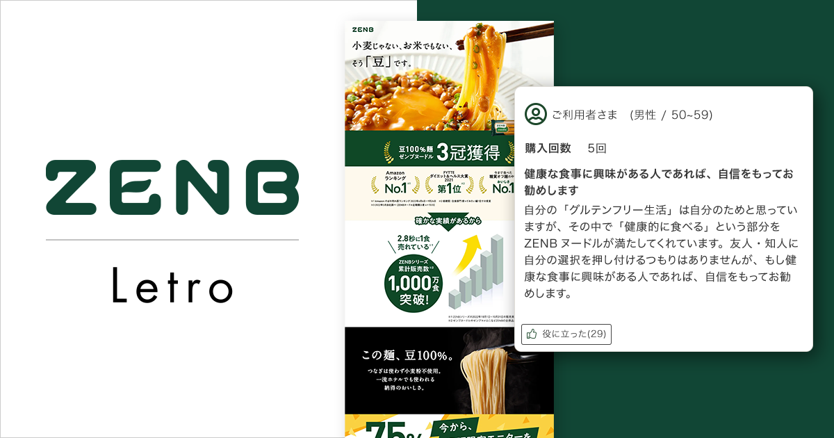 企業のマーケティングDXを支援するアライドアーキテクツ株式会社(東京都渋谷区、代表取締役社長 CEO:中村壮秀、証券コード:6081)でSaaS事業を展開するプロダクトカンパニー(カンパニープレジデント:村岡弥真人)は、株式会社ZENB JAPAN(愛知県半田市、代表取締役社長:濱名誠久、以下 ZENB JAPAN)に対し、当社の運用型UGC(※1)ソリューション「Letro(レトロ)」を活用して、新規顧客向けLPにおける獲得成果向上のためにレビュー(※2)を活用する支援を行いました。主力商品「ゼンブヌードル」のLPにおいてレビュー運用を行うことでCVR1.32倍を実現しました。