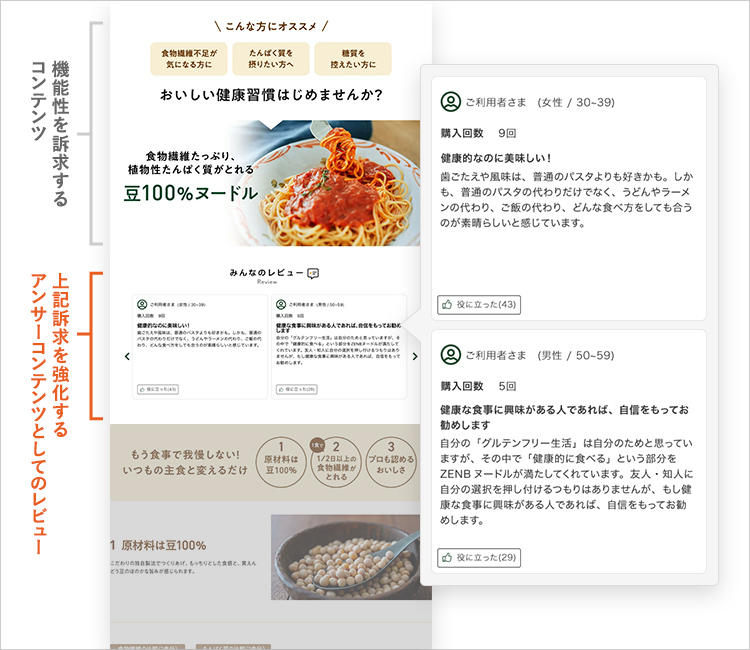 ZENB JAPANでは、新規顧客獲得向けのLPにLetroを活用し、レビューの掲載を開始しました。運用の手始めに、ページ訪問者の想定状態を踏まえて、UGCで解消すべき不安点やUGCで補強すべき情報を定義。それらを表現する項目を設計しレビューを収集しました。項目には、「年齢情報」や「購入回数情報」とともにそれぞれの訴求を引き出すための設問項目を盛り込むことで、訴求を強化することができただけでなく、年齢情報による自分事化の促進と、購入回数によるクチコミの信頼度を向上させることに成功しました。