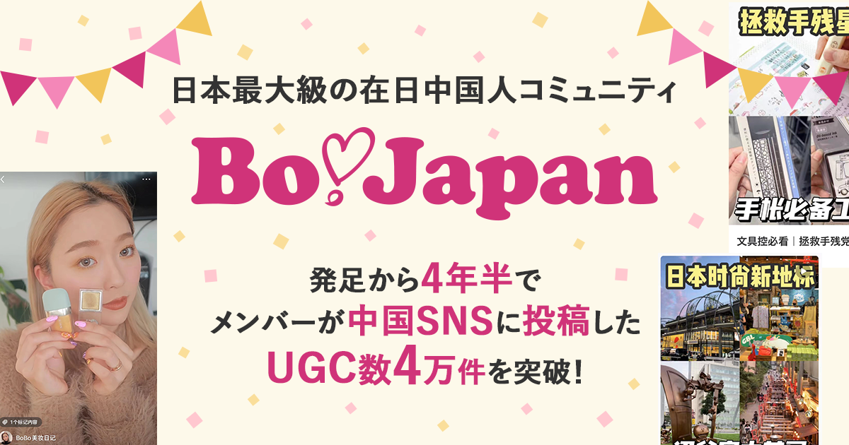 企業のマーケティングDXを支援するアライドアーキテクツ株式会社(東京都渋谷区、代表取締役社長 CEO:中村壮秀、証券コード:6081)で中国進出支援事業を展開するクロスボーダーカンパニー(プレジデント:番匠達也)は、独自に構築する日本最大級の在日中国人コミュニティ「BoJapan(ボージャパン)」が、発足から4年半でメンバーがWeibo、WeChat、RED(小紅書)、Douyin等の中国SNSに投稿したUGC数が4万件を突破しましたのでお知らせいたします。