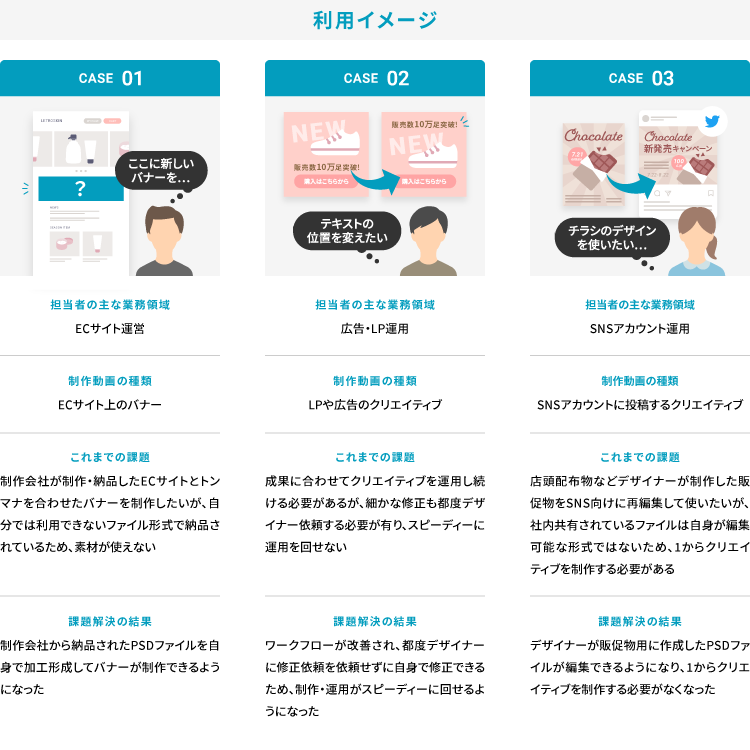 マーケティング施策の成果向上のために動画クリエイティブの量産及び運用の重要性が高まっている中で、非デザイナーが動画制作ツールを導入して内製化する動きが増えてきています。しかし、新たに動画制作を行う非デザイナーと、従来から動画制作業務を行ってきたデザイナーとでは使用するツールが異なることから、素材共有に手間がかかるという課題を抱えている企業が少なくありません。例えば、PSDファイルに対応していない非デザイナー向けの動画制作ツールを使う際には、都度デザイナーがPhotoshop内でPNGやJPGなどの対応可能なファイル形式に変換し、非デザイナーに素材を共有するという手間が発生していました。