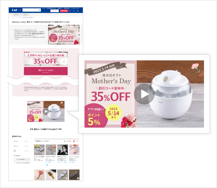 LetroStudioを活用して、公式オンラインストアの「母の日SALE 2023」特設ページに掲載する動画コンテンツを制作しました。動画コンテンツには割引の訴求に加えて、セール対象商品をスライド形式で紹介することでユーザーの関心を引きつけることに成功。同ページ内において、「静止画コンテンツ」と「LetroStudioで制作した動画コンテンツ」を比較するA/Bテストを実施したところ、動画コンテンツの方がページ滞在時間が115%に向上するなど、好調な結果となりました。