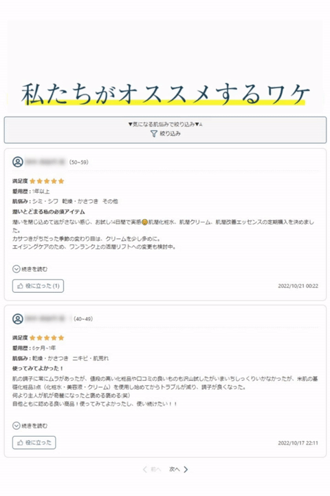 新規獲得用LPでは、Letroを通じて収集したレビューとInstagram投稿を掲載することで、CVRが1.27倍に改善。「肌の悩み」別にレビューを表示し、ターゲット毎に詳細に掘り下げることによって自分事化が促進され、獲得効率改善の大きく改善することができました。また、UGC上部のバナーを動画化することで、レビューの視認性を高めることにも成功しました。