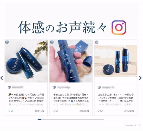 ダイレクトマーケティングを展開する米肌では、更なる売上向上を実現するために顧客獲得効率の改善にテコ入れする必要性が高まっていました。そこで、新たにレビューやInstagram投稿をはじめとするUGCの活用施策に着手。獲得効率の改善に向けて、複数のLPにおいてUGCの最適化を行うことに加え、様々な顧客接点にUGCを活用することで、よりリッチなマーケティングコミュニケーションを行うためにLetro導入に至りました。
