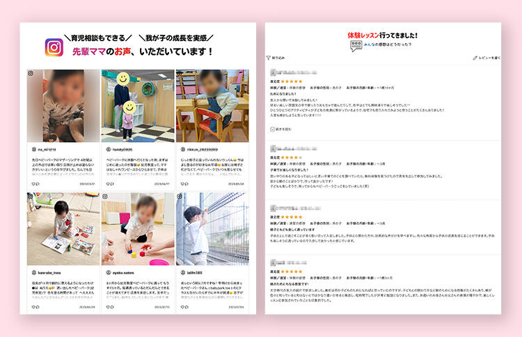 TOEZが展開する親子教室「ベビーパーク」の体験申し込みサイトにLetroを活用してUGCの掲載を開始しました。まず始めに、サイト上に掲載するUGCを生み出すために、ベビーパ―クを利用されたお客様に対してUGCの投稿を依頼。生成されたUGCを、体験申し込みサイト上に掲載しました。Instagram投稿は、ビジュアルを通じて"利用シーン"を訴求し、テキストレビューには、「利用形態」や「お子さまの年齢/性別」などの項目を盛り込むことで、"自分事化の促進"と、レビューの"信頼性向上"を狙いとしています。