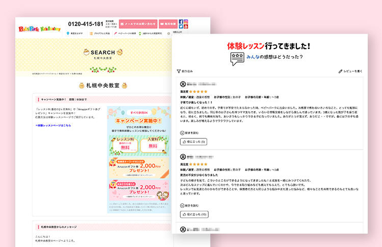 掲載後はCTR/CVRを計測しながら、表示するUGCやUGC上部のバナーなどの改善を行う運用で、接点毎に最適な訴求と見せ方をすることができ、申し込み率111%を実現しました。また、教室ごとの個別ページにもレビューを掲載し、検討意欲の高い層に対して利用者の好意的なレビューを見せることで、申し込み率は125%まで向上しています。