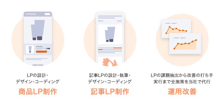 この実績を高くご評価いただき、昨今ではECメーカーだけでなく、教育・フィットネスジム・メディカルサービスなどの無形商材を取り扱う企業からもLP制作・運用のご相談をいただくことが増えてきていることから、新サービスとしての開発・提供準備を進めてまいりました。そしてこの度、LP制作・運用の成功事例が続々と誕生し、その成果が明らかとなったことから新サービスとして、LetroSolutionを正式に提供開始するに至りました。