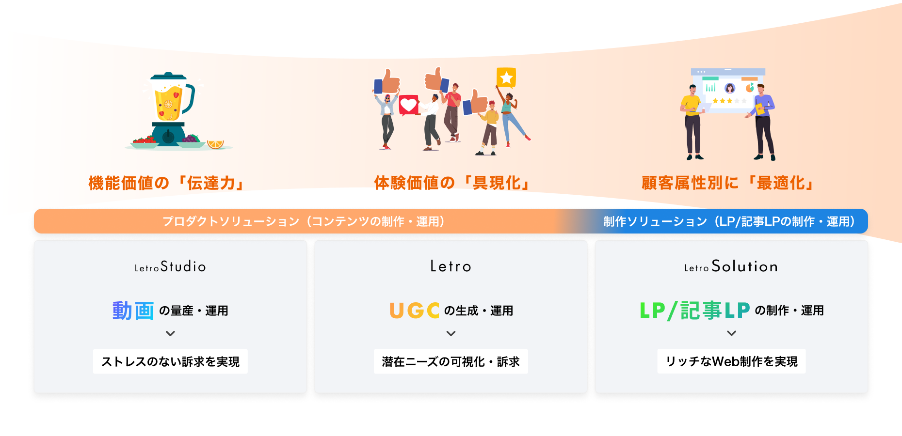 LetroSolutionは、LP・記事LPの制作・運用を行う新サービスです。得意するUGCと動画を活用することで、訴求力の高いLPの制作が可能となります。顧客の体験価値を具現化できる「UGC」を活用することで潜在ニーズの訴求ができるようになり、また機能価値の伝達力に強い「動画」を活用することでユーザーにとってストレスのない訴求を実現することができます。また、UGC運用で培った「顧客分析力」「顧客体験の創出力」を活かしたLPの設計、訴求内容を立案することで成果の高いLPの制作を実現します。
