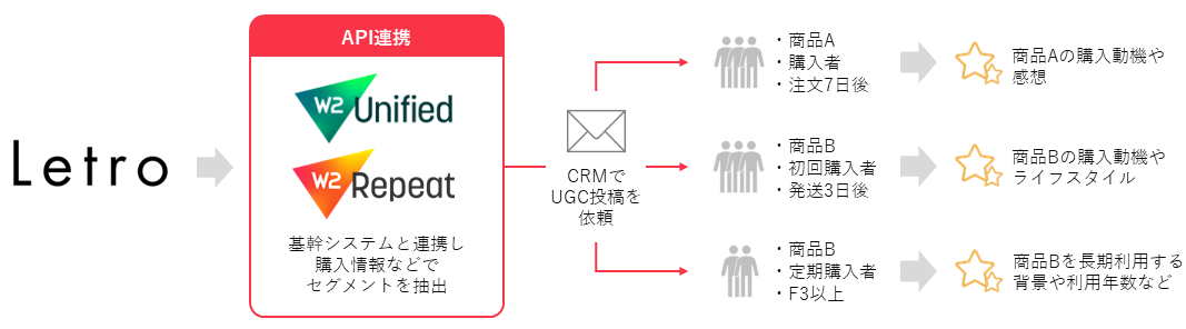 これらの課題を解決し、EC事業におけるUGCの活用を推進するため、導入数750社を超えるOMO/オムニチャネル対応のECプラットフォームW2 Unifiedと、1,000を超える機能や豊富な決済種別など、リピート通販で売上を上げる機能を搭載するW2 RepeatとのAPI連携を行い、購入者に対してUGCの投稿を促すフローを自動化するサービスを提供いたします。