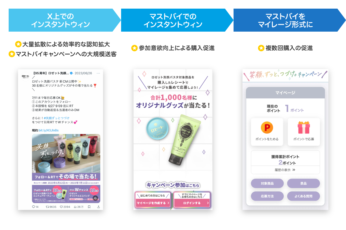 Xアカウント上で実施したキャンペーンは、「echoes Mustbuy」の仕組みを活用して手軽なフォロー&リポストの応募形式と、その場で抽選結果が分かるインスタントウィン形式によりキャンペーンへの参加モチベーションを高める工夫をしました。さらに、抽選結果を確認するためにマストバイキャンペーンのWEBサイト上に遷移するフローを取り入れることにより、マストバイキャンペーンへの大規模送客を狙いました。
