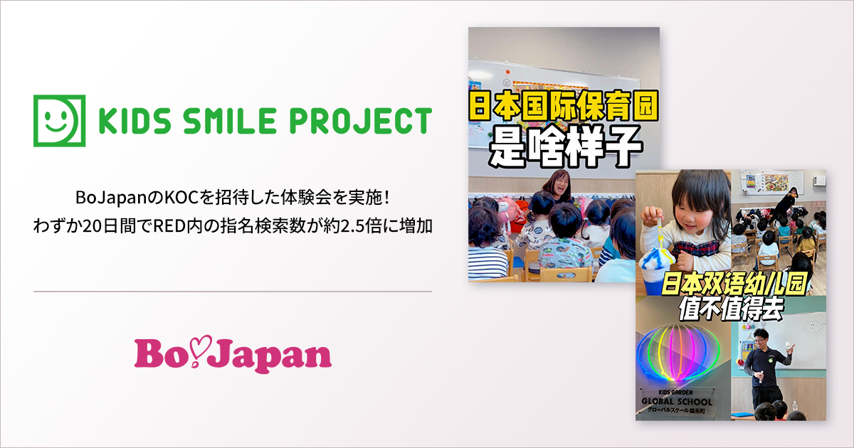 近年、REDを活用した情報発信や良質なUGCの創出が商品やブランドの認知、売上向上につながる事例が相次いでいます。そのような中、キッズスマイルプロジェクトは自社が運営する、1歳~9歳のお子さまを対象に保育・幼児教育・学童が一体となった「キッズガーデン南青山」、2~6歳の学びの黄金期に英語と日本語のバイリンガル教育を提供する「キッズガーデン グローバルスクール錦糸町」を対象に、在日中国人へのキッズガーデンの認知向上を目的としてBoJapanを活用。各施設の対象年齢に該当する子を持つKOCを親子で招待した体験会を実施しました。
