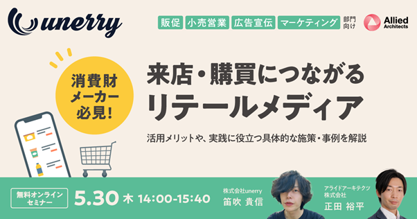 企業のマーケティングDXを支援するアライドアーキテクツ株式会社(東京都渋谷区、代表取締役社長 CEO:中村壮秀、証券コード:6081)が提供するSNSマーケティング支援SaaS「echoes(エコーズ)」は、株式会社unerryのリテールメディアプランナーを講師に迎え、「来店・購買につながるリテールメディア」をテーマにした無料オンラインセミナーを5月30日(木)に開催します。