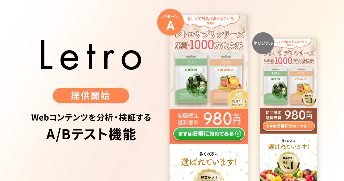 企業のマーケティングDXを支援するアライドアーキテクツ株式会社(東京都渋谷区、代表取締役社長 CEO:中村壮秀、証券コード:6081)が提供するCVR最適化プラットフォーム「Letro(レトロ)」は、Webコンテンツの分析・検証を可能にするA/Bテスト機能の提供を開始したことをお知らせします。