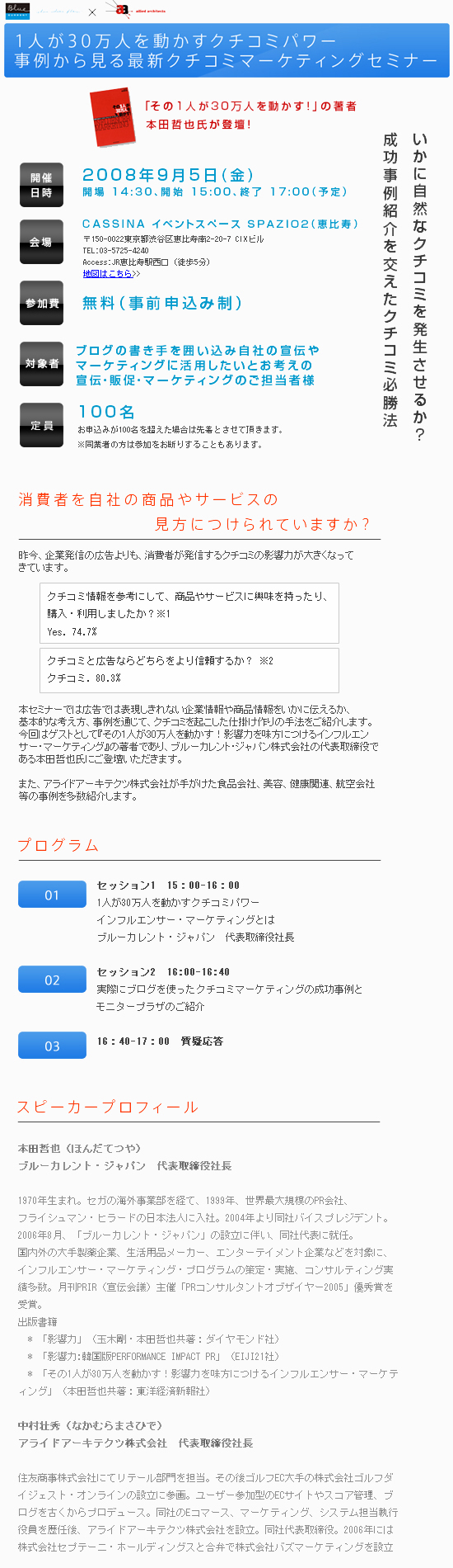 アライドアーキテクツ株式会社(本社:東京都渋谷区、代表取締役社長:中村壮秀、以下アライドアーキテクツ)は、事例から見る最新クチコミマーケティングセミナーを2008年9月5日(金)に無料で開催いたします。