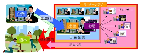 クチコミマーケティングの実施を希望する企業は、アライドアーキテクツへ出展料を支払い、『モニタープラザ』に出展します。ブロガーは、各企業のお題の中から書きたい題目を選び、自身のブログで投稿します。今回のキャンペーンでは、アライドアーキテクツが参加企業からの出展料の一部を充当し、ブロガーの投稿件数分の植林費用を充当することで実現いたしますので、記事の書き手であるブロガー、出展者である参加企業、サービス運営者であるアライドアーキテクツの三位一体での地球環境保護活動となります。