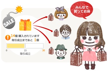 企業が提供する商品やサービスに対して、決められた数の購入希望者が集まることで、大幅な割引価格で商品やチケットを入手することができる、「フラッシュマーケティング」型の共同購入サービスです。