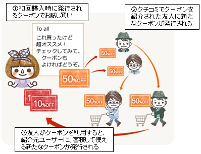 初回購入時に使用できる割引クーポンの情報を、クチコミを使って友人に伝播することでさらにお得なクーポンが入手できる、ソーシャルメディア時代に向けた新たなクーポンサービスです。