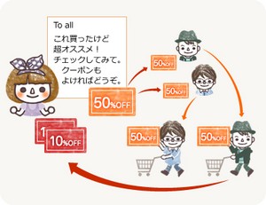 各ショップで初回購入時のみ使用できるお得な「プレミアムクーポン」を使って商品を購入し、Twitterやブログ、メールなどを使って友人に紹介することで、お得なクーポンを友人に伝播できるだけでなく、自分自身にもクーポンが還元されるという「品品プレミアムモール」ならではの新たなクーポンサービスです。