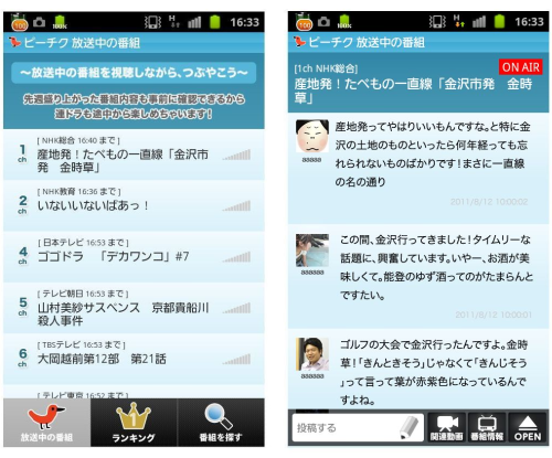アライドアーキテクツ株式会社(本社:東京都渋谷区、代表取締役社長:中村壮秀)と株式会社オレンジ・アンド・パートナーズ(本社:東京都港区、代表取締役社長:小山薫堂)は、両社が共同提供するソーシャルテレビサービス「ニッポンのお茶の間 ピーチク」(http://ptic.jp)のアンドロイド携帯向けアプリをリニューアルしましたのでお知らせいたします。