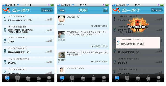 また、Android版で好評を得ている、たくさんのつぶやきが集まっているテレビ番組の情報を通知させることができる「盛り上がり通知機能」をiPhone版にも搭載しました。さらに、盛り上がりの度合いによって決定する「ピーチク」オリジナルの番組ランキングをアプリ内に掲載。"ソーシャルメディア上で話題の番組"というユニークな情報を提供することで、ユーザーがテレビ番組に向ける興味・関心の幅を広げ、新たなテレビの楽しみ方を提案します。