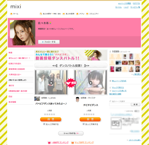 その第一弾として、10月17日より佐々木希さんの公式mixiページ(http://p.mixi.jp/sasakinozomi)で開始する企画"動画投稿ダンスバトル みんなで踊ろう!! 「パペピプポ♪」"におけるキャンペーンアプリの開発・提供を行いましたのでお知らせいたします。