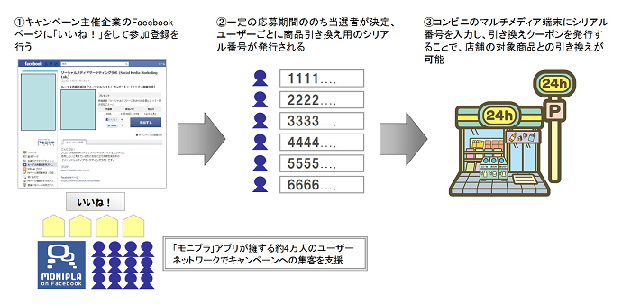 ユーザーは「モニプラ」アプリをインストールし、キャンペーン実施企業のFacebookページに「いいね!」をすることで応募ができます。当選者にはユーザーごとのシリアル番号が発行され、これを指定のコンビニに設置されているマルチメディア端末に入力することで、商品との引き換えクーポンを発行することができます。