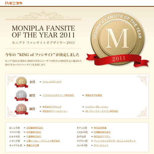 アライドアーキテクツ株式会社(本社:東京都渋谷区、代表取締役社長:中村壮秀)は、企業ファンサイトモール「モニプラ」(http://monipla.jp/)において2011年にユーザーから最も支持されたファンサイト*1の頂点を決める「ファンサイト・オブ・ザ・イヤー2011」の受賞企業を発表しましたので、お知らせいたします。